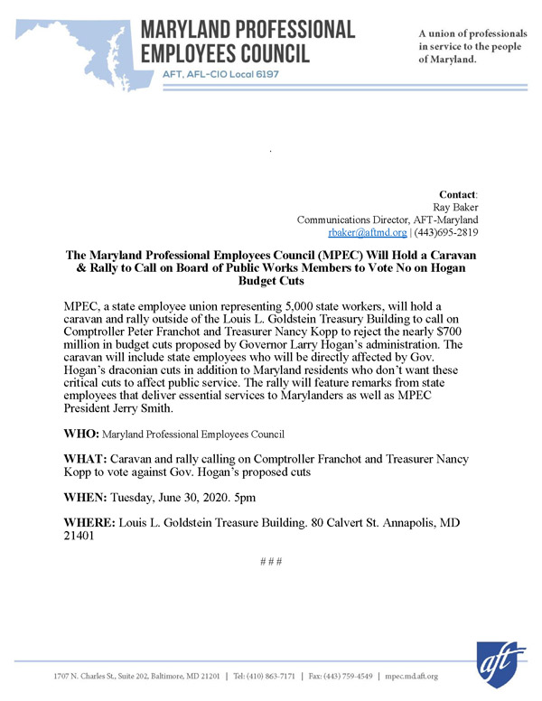 The Maryland Professional Employees Council, a state employee union made up of working professionals will hold a rally and caravan today to oppose Gov. Hogan's budget cuts.