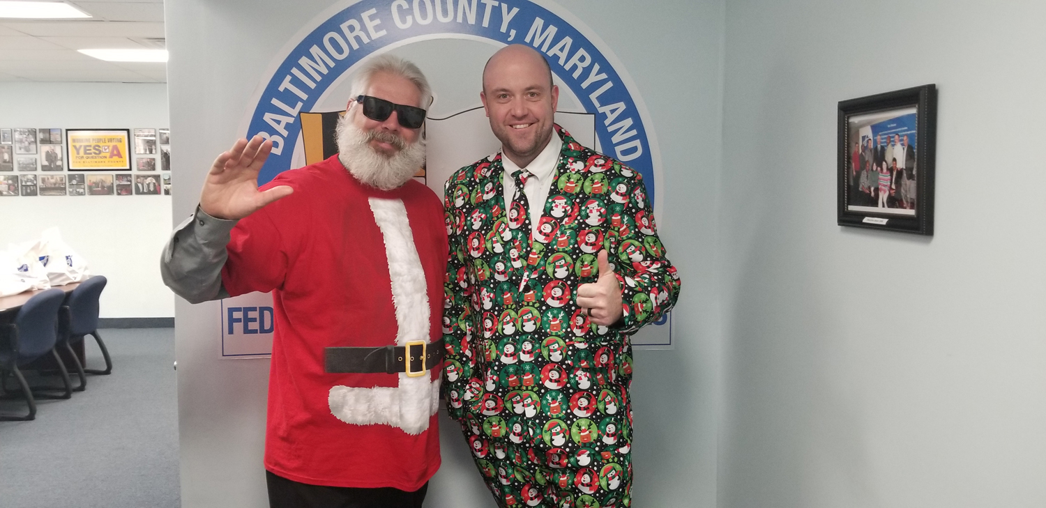 Leadership of the Baltimore County Federation of Public Employees took time out of their Christmas celebrations with their own loved ones, to deliver presents to county public safety personnel that worked on Christmas Day. President John Ripley donned a Santa costume (beard is all his own however) to spread good cheer to those working.