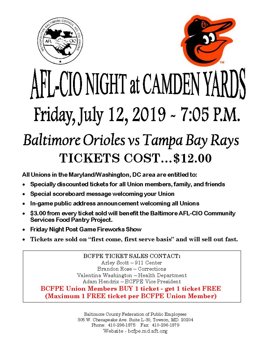 UPDATE: Tickets are still available for the AFL-CIO Union Night at Camden Yards on Friday, July 12 at 7:05 P.M. against the Tampa Bay Rays. The tickets are in section 86 and are $12. BCFPE members get a buy 1 get 1 free deal (maximum 1 free ticket per BCFPE Union Member).There will be a fireworks show following the game and the weather is looking good for that night.