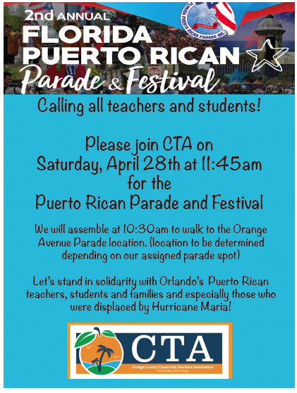 Calling all CTA members, teachers, and students! Join CTA in the 2nd Annual Puerto Rican Parade Saturday, April 28th!