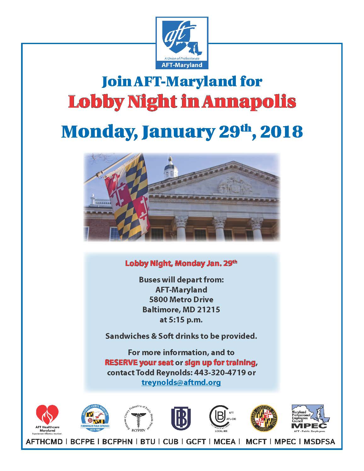 A reminder that the first AFT-Maryland Lobby Night in Annapolis will be Monday, January 29th. Buses leave the BTU at 5:15 pm. People wanting a seat on that bus will need to RSVP with Todd Reynolds—either via phone (443-320-4719) or treynolds@aftmd.org by Friday, Jan. 26th.